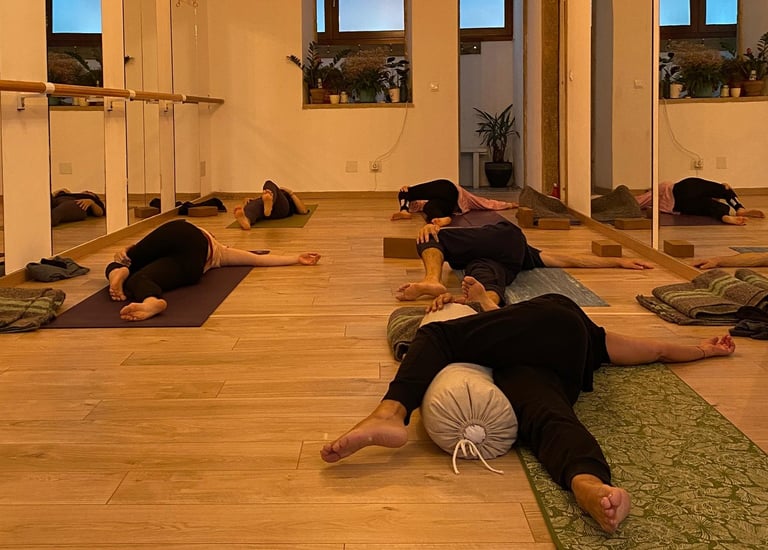 En Aguaclara Yoga, nuestras clases presenciales de Yoga Restaurativo están diseñadas para ofrecer una experiencia profundamente relajante y regeneradora. Durante una hora, te guiarán a través de posturas suaves y sostenidas que, junto con la respiración consciente, ayudan a liberar tensiones físicas y emocionales, promoviendo un descanso profundo y una mayor conexión con tu cuerpo. Este estilo de yoga es ideal para gente con movilidad limitada, principiantes o practicantes que buscan un movimiento más suave y controlado, permitiéndote recuperar la energía y el bienestar en un ambiente tranquilo y acogedor.